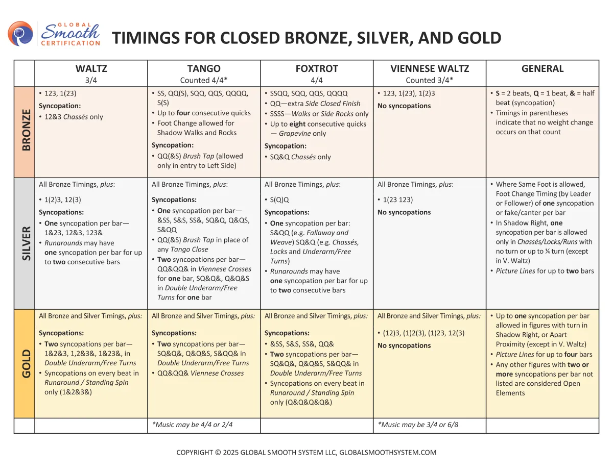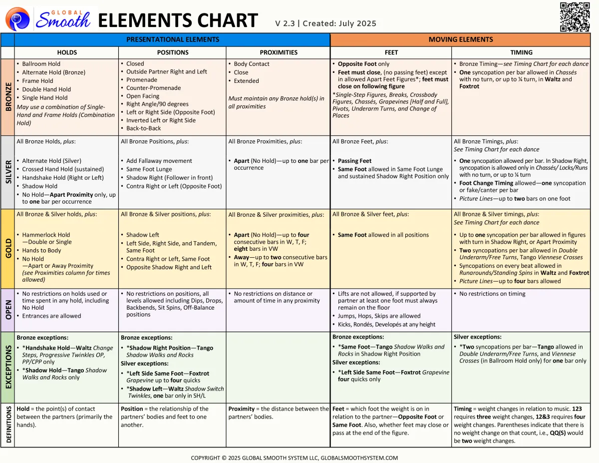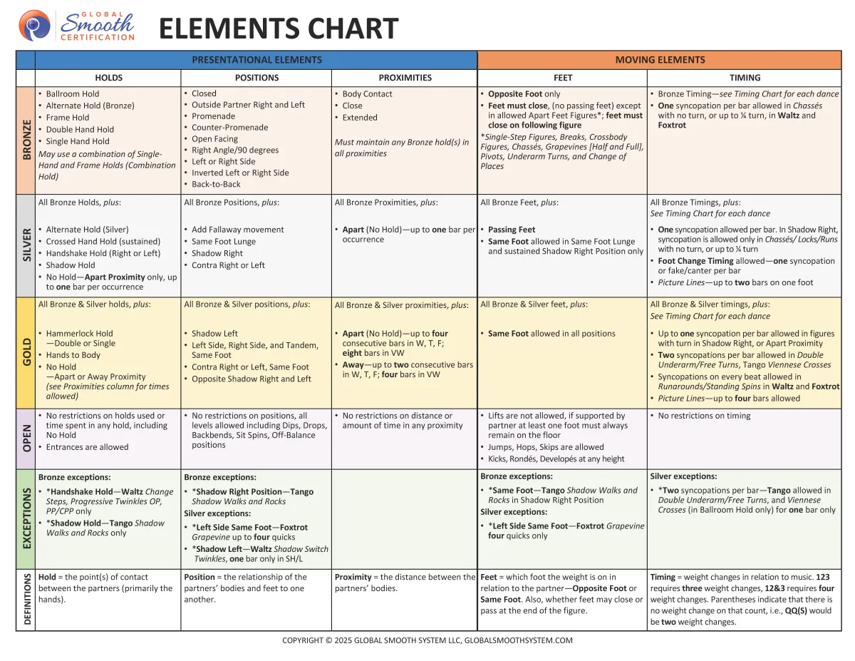 Complete the course and earn your GSC Elements Chart certification at Bronze, Silver, and Gold levels applicable to judging or adjudicating both franchise and independent closed Smooth syllabi.
